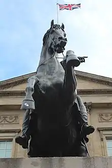 The Duke of Wellington and Copenhagen were the subject of a "colossal" bronze statue designed by Matthew Cotes Wyatt and his son James.[35] Construction of the statue began in 1840, four years after Copenhagen's death, and lasted until 1843. The 40-tonne (40,000 kg), 8-metre-long (26 ft) and 9-metre-tall (30 ft) statue was unveiled on 28 September 1846[36] with much fanfare and was hoisted into a prominent position on top of the Triumphal Arch,[35] then located a short distance from the Duke's London residence, Apsley House, on Hyde Park Corner.[37] Copenhagen's belly had a girth of 22 feet and eight inches and the section was used to host a "celebratory dinner" for Wyatt before the work was completed, and a "rider on horseback could readily pass under Copenhagen's torso without danger of scraping his beaver hat."[38] The portrayal was generally ridiculed in the press and by the public with a French spectator to the unveiling reportedly saying, "We have been avenged!"[35] A young soldier reportedly said Wyatt's statue was "warning ambitious young officers of the fate that awaits them if ever they are so unfortunate as to achieve greatness."[37] The statue was viewable from Apsley House and remained at the Hyde Park location for the remainder of the Duke's life.