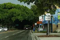State Road 972 begins on the intersection between Coral Way/Southwest 22nd Street and Douglas Road (Southwest 37th Avenue) at the Coral Gables and Miami boundary, with SR 972 heading east into Miami. It runs as a 4-lane divided road with many old ficus and banyan trees in its median through a commercial area, passing by the Miracle Marketplace a few blocks east of the western terminus. It then intersects SW 27th Avenue (SR 9), and continues straight east until an intersection with SW 3rd Avenue in the Five Points neighborhood, where Coral Way veers northeast, becoming SW 3rd Avenue, and intersects with SW 12th Avenue (SR 933), still as a commercial road. After crossing under I-95 and intersecting with SW 15th Road/Broadway just east of I-95, the historic scenic drive of Coral Way ends, as it curves back into a purely eastern direction and becomes an undivided four lane road known also as SW 13th Street, heading into the core of central Miami. Four blocks east of SW 15th Road and one block east of Miami Avenue, where the road is known as SE 13th Street, SR 972 meet its eastern terminus of U.S. Route 1 (Brickell Avenue) in the downtown Miami Financial District.[3]