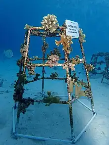 Coral reef restoration strategies use natural and anthropogenic processes to restore damaged coral reefs.[1] Reefs suffer damage from a number of natural and man-made causes, and efforts are being made to rectify the damage and restore the reefs. This involves the fragmentation of mature corals, the placing of the living fragments on lines or frames, the nurturing of the fragments as they recover and grow, and the transplantation of the pieces into their final positions on the reef when they are large enough.