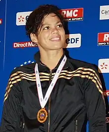 Coralie Balmy (born 8 June 1987) is a French freestyle swimmer. Balmy was born in La Trinité, Martinique.[1] She won her first senior title at the 2008 European Aquatics Championships in Eindhoven in the 4 × 200 m relay freestyle. At the same Championships she won the silver medal in the 400 m freestyle with the time of 4:04.15, all-time fourth fastest behind Federica Pellegrini's world record.[2] At the 2008 Summer Olympics in Beijing, she finished fourth in the 400 m freestyle final.[3] On 6 December 2008 she set the world record for the 200 m freestyle (short course) at the French National Championships in Angers, France in a time of 1:53.16. At the 2012 Summer Olympics her 4 × 200 m freestyle team won the bronze medal in a time of 7:47.49. The split times: Camille Muffat (1:55.51); Charlotte Bonnet (1:57.78); Ophélie-Cyrielle Étienne (1:58.05); Coralie Balmy (1:56.15).