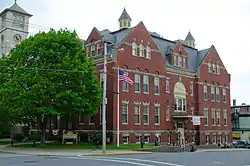 The Corcoran School is an historic school building at 40 Walnut Street in Clinton, Massachusetts. The 2+12-story brick Colonial Revival building was built in 1900 to a design by Boston architect Charles J. Bateman. The rectangular building rises above a raised foundation to a truncated hip roof with a variety of gabled dormers and two cupolas. The entry is centered on a seven-bay facade, beneath a slightly projecting pavilion that rises a full three stories. The entry is recessed under a large round arch, above which is a portico supported by Ionic columns. On the second level of the pavilion are three long, narrow, round-arch windows with granite keystones above, and on the third level are two rectangular sash windows topped by blind arches.[2]