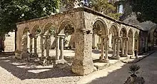 The cloister was made from limestone which is prevalent in the Saint-Emilion area. Its architecture is Romanesque in style, rubbing shoulders with the old Gothic-style chapel and church. Its columns are monolithic, in other words cut from a single stone from the base to the capital. Small crests are hidden in the abacuses. The Romanesque rounded arches were built in the 14th century and stand near additional Gothic pointed arches in the background. Other visible elements include a small tower which is the remains of the church tower, a very simple sweeping arc spanning the church from one wall to the other, columns without capitals, and windows.
