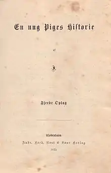 Her literary career began when she was 24 with En ung Piges Historie (A Young Girl's Story, 1860) inspired by Charlotte Brontë's Jane Eyre. Like several other Scandinavian novels in the mid-19th century, it tells how a woman experiences hardship after seeking work as a governess outside the home but finally returns home to begin a happy life.[5] It was a huge success, running to eight editions in Danish by the end of the 19th century and translated into several other languages.[6]