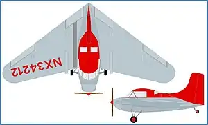 The Mallard was the third aircraft type produced by Cornelius Aircraft.[1] The first two, the FreWing and the LW-1 were conventional in layout but unusual in using independently variable incidence wings for pitch and roll control. The wings of the Mallard could also be adjusted in the air,[1][2] but they were of low aspect ratio with marked forward sweep. The trailing edge carried conventional ailerons near the tips and elevators close to the fuselage. The Mallard was also a tailless aircraft, in the sense of lacking a horizontal tailplane. The rest of the aircraft was conventional, with single fin and rudder and a side-by-side cockpit for two behind a flat four engine. The undercarriage was fixed and of the tailwheel type. Like other Cornelius designs, the sole Mallard was built by the Spartan Aircraft Company.[1]