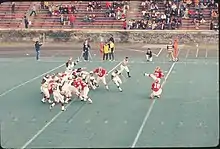 The Thanksgiving Cornell–Penn football game, broadcast on national radio before the television era, attracted huge crowds to Franklin Field in Philadelphia.[1] The 1931 game attracted a reported 70,000, and earned a story on the front page of the Philadelphia Inquirer along with a quarter-by-quarter breakdown of every detail of the game.[6] The 1947 game attracted a crowd estimated at "about 80,000".[7] The 1959 game attracted 23,661.[7] By 1965 attendance was down to 10,543, and the Thanksgiving tradition was ended and a standard home-and-away schedule was instituted.[7]