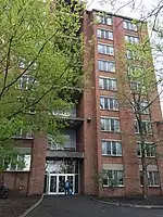 Mary H. Donlon Hall is a residence hall located at the center of North Campus and has a gross area of 133,594 sq ft (12,411.3 m2) and net area of 116,094 sq ft (10,785.5 m2). Built in 1961, it houses 472 first-year students arranged in double rooms (with a few singles and two "quads," three-room-suites for four students, per floor), typically sized 12' x 18'. It has a unique triangular structure separated onto 6 floors. Facilities include a TV/social lounge, piano, laundry, elevator, kitchen, computer networking, study lounge, lofting furniture, and library. The study lounge located on the first floor is nicknamed 'The Morgue' due to its notoriously dim lighting, silence, and freezing temperatures for most of the year.