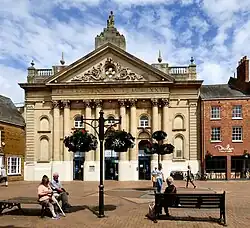 The new building was designed by William Hill of Leeds, built by Messrs Kimberly of Banbury in ashlar stone and was officially opened on 3 September 1857.[5] The design involved a symmetrical main frontage of five bays facing onto the Market Place. The central section of the three bays featured tall round headed openings with architraves and keystones on the ground floor, and small round headed windows with architraves on the first floor. The outer bays contained blind round headed windows on both floors. The bays of the central section were flanked by pairs of Corinthian order columns supporting a frieze, an entablature and a pediment. There was a quatrefoil surmounted by a ram's head as well as fruit and foliage in the tympanum, and, at the apex of the pediment, there was a statue of the Roman goddess of agriculture, Ceres.[6] The elaborate stone carving was undertaken by Thorpe and Ponder.[7] The architectural historian, Nikolaus Pevsner, criticised the design describing it as "a pompous classical palace".[8]