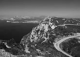The scenic Corniche des Crêtes road crossing the Cap Canaille through the Parc nationale des Calanques. The Massif des Calanques appears in the background.
