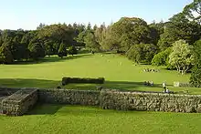 Campbell gave the land to Cornwall Park Trust, a trust he had established for the purpose. The park was described at the time as "two hundred and thirty acres of the finest land in the district", or 93 hectares, a portion of some 1,100 acres (450 hectares) at One Tree Hill bought by Dr Campbell many years before. He had planned to build a house there and planted the parkland in preparation for that but he subsequently chose to live near the centre of the city in Parnell, his home was named 'Kilbryde' and situated on part of the site of their rose gardens.[2] Still marked by his trees the carriage drive he made in Cornwall Park sweeps in an S-bend from Puriri Drive across Greenlane west of the Park's Greenlane entrance to his house site near Huia Lodge. Visitors may walk along it from the gate opposite the Park's administration and works depot in Greenlane. There were to be further gifts including the land about Puriri Drive and Campbell Crescent and the endowment lands, housing sites to be made available on 21-year leases.[4]