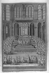 The coronation of the Danish monarch was a religious ceremony in which the accession of the Danish monarch was marked by a coronation ceremony. It was held in various forms from 1170 to 1840, mostly in Lund Cathedral in Lund, St. Mary's Cathedral in Copenhagen and in the chapel of Frederiksborg Palace in Hillerød.
