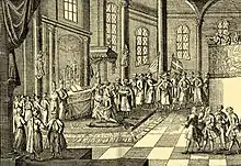 The coronation of the Hungarian monarch was a ceremony in which the king or queen of the Kingdom of Hungary was formally crowned and invested with regalia. It corresponded to the coronation ceremonies in other European monarchies. While in countries like France and England the king's reign began immediately upon the death of his predecessor, in Hungary the coronation was absolutely indispensable: if it were not properly executed, the Kingdom stayed "orphaned". All monarchs had to be crowned as King of Hungary in order to promulgate laws and exercise his royal prerogatives in the Kingdom of Hungary.[1][2][3] Starting from the Golden Bull of 1222, all new Hungarian monarchs had to take a coronation oath, by which they had to agree to uphold the constitutional arrangements of the country, and to preserve the liberties of their subjects and the territorial integrity of the realm.[4]