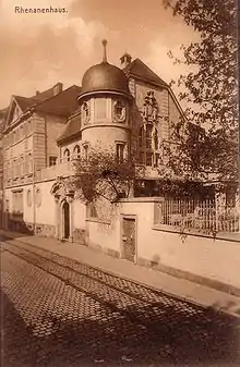 After Corps Rhenania celebrated in alternating taverns throughout Heidelberg (e.g. "Seppl", lastly in "Weinberg" at Marktplatz), a baroque city house at Hauptstrasse 231 was acquired in 1882 as a Corps-house and the foundation of the "Rheinländischen Gesellschaft" as the subject of rights and duties. The house had previously been owned by the theologian Carl Daub and his son-in-law, Wilhelm Theophor Dittenberger. As the old house did not comply with altered representation necessities, it was torn down and today's Corps-house was erected in the years 1906-1909 according to the plans of the königlich-bayerischen Hofoberbaurats (Royal Bavarian Chief Government Building Officer), Eugen Drollinger. Simultaneously, the house at Neckarmünzgasse 14 behind the garden of the Corps-house was bought and turned into a dormitory.