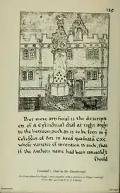 The Pelican Sundial was not the first sundial at Corpus. Before it was erected, one had been designed for the college by Nicholas Kratzer, an astrologer and horologer for Henry VIII.[46] Like Juan Luis Vives, he was probably one of Cardinal Wolsey's lecturers who resided at Corpus while waiting for the completion of Cardinal College.[47] Kratzer designed many dials, however only three can definitely be attributed to him: fixed ones for the University Church of St Mary the Virgin and Corpus and a portable one for Cardinal Wolsey. Only Wolsey's survives;[lower-alpha 1][49] Kratzer's Corpus dial stood in the garden until around 1706, when the gardens were remodelled for the construction of the Fellows' Building.[50]