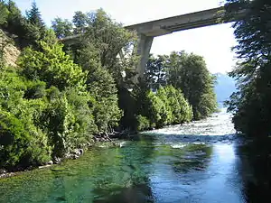 The Correntoso River is a river located in Villa La Angostura, Argentina. This river runs from Correntoso Lake to Nahuel Huapi Lake, standing out as one of the shortest rivers in the world,[1] with between 200 and 300 m in length (depending on the height of the lakes). This river is famous among the fishing enthusiasts, due to the abundance of large trout, especially at the mouth of Nahuel Huapi Lake.[2][3]