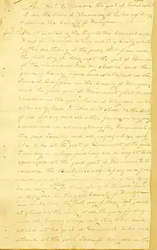 In addition to its role as the capitol of the Indiana Territory, Corydon served as the site of a constitutional convention to consider statehood for Indiana in 1816. Forty-three delegates convened from June 10 to June 29, 1816, to draft Indiana's first state constitution.[5] Sources disagree on the exact location of the gathering. Because the courthouse was not completed at that time, the delegates met at "the courthouse on the hill," which may have referred to a nearby log home that the territorial government had rented.[6] Cramped conditions and the summer heat caused the men to gather under a giant elm tree, which was later named the Constitution Elm. The town's historic district includes a portion of the tree's preserved trunk, surrounded by a sandstone memorial.[6][7]