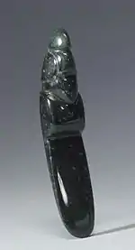 1. Axe Gods: Generally these are stylized figure pendants that look like they were made from axes or celts. They are two-dimensionally decorated on the front with three main segments. The first is the top of the head to the top of the shoulders, where holes are drilled to suspend the object. The second is from the top of the shoulders to the bottom of the wings or arms. The third section is the blade of the pendant, it goes from the bottom of the wings or arms to the base, which consists of 30-40% of the entire pendant. There are two types of Axe god figurines, Avian and Anthropomorphic. The earliest known jade work is the Avian axe god celt found at the site of La Regla, dated at 500 BC.
