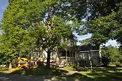 The Cotton-Smith House is a 2+1⁄2-story wood-frame structure, set on a granite and brick foundation on a sloping lot in a residential area near Fairfield's town center. It has a truncated hip roof with slate shingles, and several large gable projections. The front (west-facing) facade has two sections: the left side has a round-arch three-part window with a pair of sash windows above, and the right, which projects slight, rises to a full-height gable, has a polygonal window bay topped by a hip roof with a small gable, a pair of sash windows above, and smaller windows in the gable. The gable is decorated with wooden panels that have intricate sawn details. The south elevation, where the main entrance is located, has a projecting section near its center, with a single-story porch running forward from that projection, supported by turned posts and balustrade. Behind the house stands a matching carriage house, which is gambrel-roofed and rests on a brick foundation. It has the same basic design features as the house.[2]