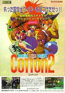 Cotton 2: Magical Night Dreams[lower-alpha 1] is a 1997 scrolling shooter arcade video game developed by Success and published by Tecmo.[1][2][3] The fourth installment in the Cotton franchise, it is the arcade sequel to Cotton: Fantastic Night Dreams. In the game, players assume the role of either the titular young witch or her rival Appli who, alongside their companions Silk and Needle, sets out on a quest to defeat several monsters and retrieve the missing "Bluewater Willow" candy to Pumpkin Kingdom. Its gameplay is similar to the first game, consisting of shooting mixed with fighting and role-playing game-esque elements using a main three-button configuration. It ran on the ST-V hardware.