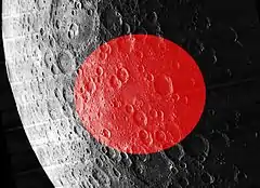 Oblique Lunar Orbiter 5 image, with the approximate extent of the basin highlighted in red