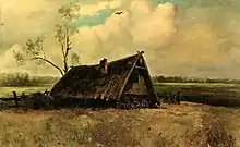 The hut of the peasant Mikhail Frolov (often mistakenly called Andrei Sevastyanovich Frolov or, following Leo Tolstoy, Andrei Sevastyanov),[6] in which the council took place, burned down in 1868 but was restored in 1887. Since 1962, it is a branch of the Borodino Panorama Museum. The initial appearance of the hut is reliably known thanks to a number of studies carried out in the 1860s by Alexei Savrasov.