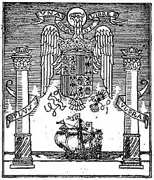 - ↑ The correspondent order in the Boletín Oficial del Estado established as default members the officiales holding the following offices: minister of Foreign Affairs, Director of the Archivo de Indias, the National Felegate of the Exterior Service of de F.E.T. y de las J.O.N.S (then Felipe Ximénez de Sandoval, double appointment),[7] the Subsecretary of Foreign Affairs (then Juan Peche y Cabeza de Vaca),[7] the Chief of the Section of Cultural Relations of the Ministry of Foreign Affairs (then the marquis of Auñón),[7] the Subsecretary of Press and Propaganda (then Antonio Tovar, double appointment),[7] Subsecretary of Commerce, Secretary-General of the Ministry of the Navy, the Director General of Maritime Communications, the National Delegate of the Feminine Section of Falange Española Tradicionalista y de las JONS (then Pilar Primo de Rivera, double appointment),[7] the National Delegate of the Frente de las Juventudes (then Sancho Dávila y Fernández de Celis),[7] the President of the Institute of Political Studies (then Alfonso García Valdecasas),[7] the National Delegate of Press and Propaganda of FET y de las JONS (then Ramón Serrano Suñer),[7] the Spanish ambassadors to Argentina, Cuba, Chile, Mexico and Peru, the consul general in the Philippines (then José Castaño),[7] the Prior of the Convent of Dominicans of San Esteban in Salamanca, and the Prior of the Convent of La Rábida.