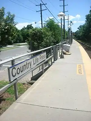 The station was originally opened in 1911 for the sole purpose of serving the book publisher Doubleday, Page & Company, which had moved in 1910 from Manhattan to Garden City, where co-founder and vice-president Walter Hines Page lived. It is named for the publisher's "Country Life Press" that was located across the tracks.[4] Country Life Press station has some former rights-of-way that led to the West Hempstead and the Oyster Bay Branches.[5] It also included the remnants of the Central Branch of the Long Island Rail Road that terminated near Nassau Coliseum.