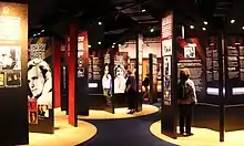 Musical symbolism continues within the museum galleries. Hardwood floors, curtain-like exhibit-case fronts, and low hanging lights suspended by cables create the backstage atmosphere of the Third Floor. Similarly, modular exhibit stations and vinyl floors evoke a recording studio environment on the Second Floor.