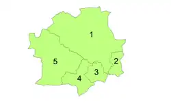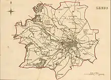 The city boundaries remained unchanged from 1836 until 1912. In 1904 the city council applied unsuccessfully to the Local Government Board for an enlargement of the county borough.[20] A second application was made late in 1911. The corporation sought to add 4,839 acres (19.58 km2) to the north and east of the city: the parishes of Roundhay and Seacroft (comprising Leeds Rural District), the parish of Shadwell (from Wetherby Rural District) and the Crossgates area of the parish of Barwick in Elmet (from Tadcaster Rural District). The proposed extension would increase the county borough's population by 7,603 to 452,171. An inquiry was held in January 1912, at which the strong opposition of the West Riding County Council and all the parish and rural district councils involved was made clear.[20][21] On 4 May the town clerk of Leeds was informed that the extension had been granted, with the exception of 169 acres (0.68 km2) of agricultural land with an estimated population of 50 to 100.[22]