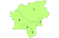 In 1919 the city council sought another extension, this time to the south, by taking in the parish of Middleton from Hunslet Rural District. The boundary change took effect on 1 April 1920, and Middleton formed a 17th ward, electing 3 councillors and 1 alderman to the city council, which was increased in size accordingly. The parish of Middleton was abolished, with its area added to the existing parish of Hunslet.[24] The extra territory was acquired by the county borough for a major scheme of council housing, the construction of which commenced almost immediately.[25] On 1 April 1925 the five parishes in the county borough were united into a single parish of Leeds.[5]