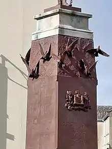 The County Fermanagh War Memorial was renovated in 1990-91 by Phillip Flanagan and Richard Pierce. The world war engravings were recut and a new section, 1 metre (3.3 ft) high, added to the plinth.[1] The additional section contains depictions of 11 doves (each a unique sculpt) to commemorate those killed in the 1987 bombing and their names were also added to the memorial.[1][9] The central section of the plinth was also painted dark red around this time (photographs from 1987 show it as natural stone).[15] After the renovation, the memorial stands 6 metres (20 ft) high and approximately 4 metres (13 ft) square in plan.[1]