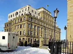 An extension down to the Side and the top storeys were designed by Cackett, Burns Dick and McKellar and completed in 1933.[1][5] Following the creation of the county of Tyne and Wear in 1974 the County Hall still remained extraterritorial to the county of Northumberland, and in the late 1970s Northumberland County Council decided to re-establish County Hall in Morpeth, to provide them with a meeting place within the actual territorial limits of the Northumberland county; the county council completed the move to Morpeth in April 1981.[6]
