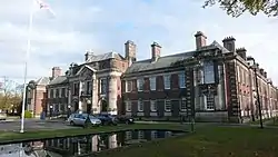 The external walls were made from local stone (from Whitby and Farndale), with the west facing main entrance side of the building being faced with red bricks from Leicestershire, although local bricks were used internally.[10][8] The roof was finished with slate from Westmorland and the main entrance into the grounds that the hall is set in, has been described as "impressive" as it is lined with hedging, trees and decorative ponds.[11] The interior of the building included Derbyshire Limestone, and white Sicilian and black Belgian marble in the entrance floor.[12] When built, the council chamber was markedly different as it had Diocletian windows and a cupola that hid an early air conditioning system.[13] The building had extra sections added in 1916, 1930 and 1940[14] and many other ancillary buildings were added to the site.[15]