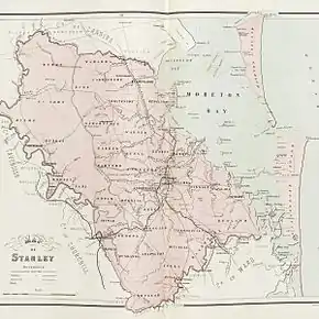 The County of Stanley is a cadastral division centred on the city of Brisbane in Queensland, Australia, that is used mainly for the purpose of registering land titles. It was named after Edward Stanley, who was three times British prime minister in the 1850s and 1860s.[1] It is bounded by the Logan River in the south, the Brisbane River at what is now Lake Wivenhoe in the west, the Stanley River at what is now Lake Somerset in the north-west, and Caboolture River in the north. It includes Moreton Island and Stradbroke Island, and extends west to Ipswich's CBD, south to Loganlea and north to Morayfield.