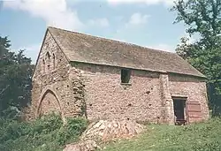 The barn is constructed of Old Red Sandstone rubble with a tiled roof.[1] The interior has "a much earlier look" than the exterior, and may comprise more of the original 12th-century work.[1] The architectural historian John Newman describes the building as having been "extended and brutally adapted after the Dissolution."[3] One gable end has "a full-width arch...and above it a handsome group of three lancets."[3] It also has two notable cusped windows, dating from the 14th century.[4]