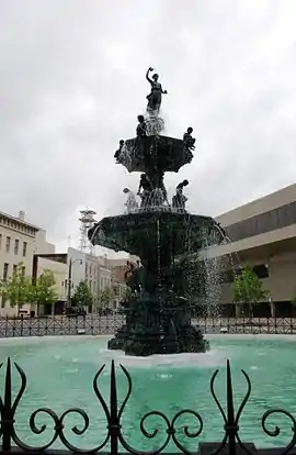 The sculpture of Hebe at the top of the fountain was likely modeled on a sculpture by Antonio Canova.[10][11] Nearly identical fountains can be found at Fountain Square in Bowling Green, Kentucky, and Court Square in Memphis, Tennessee, all cast by J.L. Mott Ironworks of New York.[10][11]