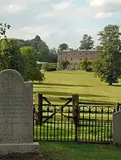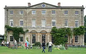 The village has developed around the Courteenhall House estate.[7] The landscaped park covers about 370 acres (150 ha), with formal gardens close to the house.[8] The estate was purchased from Richard Ouseley by Samuel Jones, the son of a London merchant, in 1647. Samuel was knighted in 1660, was High Sheriff of Northamptonshire for 1652–53 and died in 1673. His estates were inherited by his great-nephew Samuel Wake, a younger son of Sir William Wake, 3rd Baronet of Piddington. The Wake family is reputedly descended from Hereward the Wake, a Saxon hero of resistance to the Norman Conquest of England.[9] The park was designed in 1791 by Humphry Repton sic[6][7] for Sir William Wake, 9th Baronet. The Hall, like the park, dates from 1791 on a site selected by Repton and is by a little-known architect Samuel Saxon.[7] It is private property but may be viewed in the distance from Courteenhall village church. Although sheep graze over the grounds of the main park, they are kept out of the Hall's garden by a ha-ha. Courteenhall House is still occupied by the Wake family, the head of which being Sir Hereward Charles Wake, 15th Baronet.