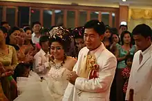 The wedding usually lasts for a day and a half. It starts at the bride's home followed by a religious ceremony and exchange of ritual gifts. The garments worn are covered with jewelry as a mark of respect to the parents of bride and groom, and all the couple's relatives and friends are present. The parents offer blessings and the couple prays to the monks for a happy life. In theory a man could have only one wife.