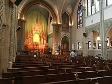 The interior decorations are especially suited to All Saints' former status as a cathedral. Dominating the Dickens Avenue facade is a massive stained glass window installed in the early 1940s which portrays Saint Cecilia, the patroness of Music above the shield of the Western Diocese. All the paintings are on canvas and the Gothic motif is reflected throughout in the shrines, altars, Stations of the Cross and the canopies over the doorways. There are strong parallels between the church's internal painting scheme with its art nouveau-like flairs and the painter of many of Kraków's most famous Gothic churches Stanisław Wyspiański, making the church unique in this respect among Chicago's Polish churches. The main altar was imported from Italy, a gift of the ladies rosary sodality, and was originally designed to have its paintings change to reflect the different seasons of the liturgical year, a unique innovation. The Christmas season would have featured Mary and the Child Jesus; Lent, Jesus on the Cross; and Easter, the Resurrected Savior. The hand-carved altar rails, now removed, had portrayed The Passion of the Christ through such powerful symbols as palm, snake, wheat, fish, bread baskets, money bags, chalice, reed and rooster. Several of the other stained glass windows commemorate Polish Saints and writers, while the angels painted along the nave walls carry the crests of cities in Poland where the immigrants hailed from. The small altars along the east and west walls were carved by former parishioner Jan Wellnitz, and were originally installed in the 1910 church located next door.