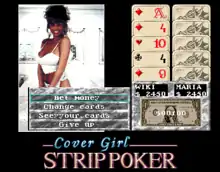 Cover Girl Strip Poker is played as five-card strip poker; the player plays against an AI opponent, and may choose between eight models.[8] Strip Poker has a multiplayer mode wherein up to three people may play against a single AI opponent at once, with each player having their own pool of money to bet with.[31] Each time the AI loses $2,000, a digitized female model removes one item of clothing[11] in video footage presented on the screen of a digitized cinema;[13] different models display varying levels of nudity.[8][31] Each player is dealt a hand of five cards, and may replace any number of those cards with different cards from the deck in order to obtain a winning hand.[28][31] Both the player and the AI are given $2,500 to bet with,[28] the maximum bet being $999,[3][32] and there are two rounds of betting: one before the changing of cards and one after.[28][31] If the player's hand is better than their opponent's, the player wins the betted money, and the cards are shuffled and both players are given new hands of cards.[28][31] The game is coded so that after winning several hands, subsequent hands are harder to win.[28][31]