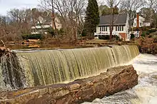 In 1970, an earth dam was built in the Cary/Morrisville area.[6] The U.S. Department of Agriculture Natural Resources Conservation Services (USDA NRCS) designed dam is 1,320 feet long and 45 feet tall.[6] Originally called Crabtree Creek W/S Structure #3, the dam is now called the Fred G. Bond Dam because of its association with Bond Lake and the Fred G. Bond Metro Park in Cary.[6][7] The dam was repaired during the winter between January 2016 and January 2020.[7]