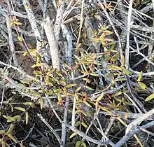 The typical form, with small lanceolate leaves, occurs in the Little Karoo, the Great Karoo as far as Namibia, and in surrounding karooid and mountainous areas, as well as the Overberg in the southern Cape. The rare variety virgata is only found in the far western Namaqualand, and has smooth leaves on erect branches. The form that occurs around Worcester, in the south-west, also decumbent, sometimes has thin, glabrous leaves and only the young stems are slightly hairy.