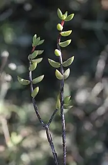 Crassula subaphylla is a small, dense to sparse, straggly shrublet, consisting of numerous brownish stems and branches, 15 – 30 cm tall (up to 60 when scrambling in vegetation). Branches are wiry, woody, but thin and brittle, twiggy (usually decumbent), with flaking strips of bark. Younger branches are slightly velvety (puberulous), reddish-brown, carnose. The leaves are widely dispersed along the branches with internodes of 0.5 — 1 (-3) cm, variable in shape, hairiness and colour (greyish- or reddish-green to yellow-green), distinctively pointed/conical (lanceolate-linear), and easily break off, 5 – 23 mm long and 4 – 8 mm in diameter. It flowers in spring to mid-summer with thyrses up to 8 cm tall with numerous dichasia. The flowers are cream with brown anthers, tubular, panduriform, to 5 mm, have distinctively recurved membranous wings on both sides of the petal tips.[2][3]