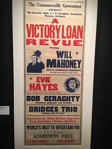 World War II poster from 1944 published by the Commonwealth of Australia publicising Will Mahoney's Troop, including Evie Hayes, Bob Geraghty and the Bridge Trio, for their performance at the Cremorne Theatre, Brisbane.
