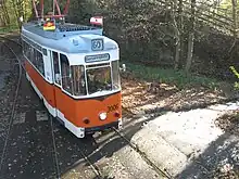 The museum's overhead wire system has been built so that trams with any type of current collection can be used. The museum currently houses trams with trolley poles, bow collectors and pantographs.[21] The current is supplied at 600 volts DC.[22]