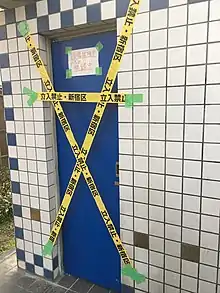 The tape is often wrapped and affixed as a visual warning sign and demarcation, for instance against entering a dangerous area, such as an industrial or commercial building site, a roadworks construction site or the scene of an accident[1] or a crime (for crime scene preservation), or against handling inoperative machinery or appliances.