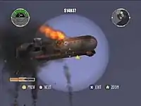 Several levels in the game are structured similarly to the open-world missions of the Grand Theft Auto series.[4][10] On these stages, missions are represented by icons located throughout the game map. The player triggers a mission by flying to one of these icons; the events of the mission then unfold on the same environment.[4] A predetermined set of story missions advances the game's plot during these levels.[5] In addition to pursuing story-based missions, the player may explore the area, steal additional aircraft, complete optional missions, plunder neutral airships, or participate in air races. These actions may earn the player money, which is necessary to use repair stations or to upgrade a player's aircraft.