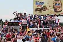 A part of the team's support consists of fans of Dinamo Zagreb and Hajduk Split, the two largest clubs in Croatia's top domestic football league, the Hrvatska nogometna liga (HNL).[209] Both sets of fans—Bad Blue Boys from Zagreb and Torcida from Split—have been associated with hooliganism due to their ultra-style support,[210][211] though violence between them does not occur at international matches. Other ultras groups are Armada Rijeka, Kohorta Osijek, Ultras Vinkovci, Tornado Zadar, Funcuti Šibenik and Demoni Pula. Support for the team also comes from Croats of Bosnia and Herzegovina, particularly from fans of Zrinjski Mostar and Široki Brijeg.[212] There are also Croatian communities in Australia, North America and South America that follow the team.[213][214] The team's fanbase is known for their use of pyrotechnics, fireworks, and flares at matches and while celebrating. During the qualifiers of Euro 2016, Croatian fans disrupted matches against Italy and the Czech Republic by throwing flares from the stadium onto the field.[215][216]