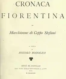 - ↑ Niccolò Rodolico, ed., Cronaca fiorentina di Marchionne di Coppo Stefani (Citta di Castello, S. Lapi, 1903)