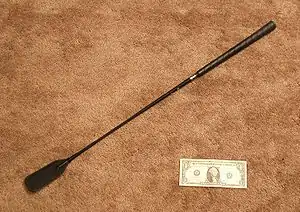 A 76-centimetre (30 in) riding crop, with a 16-centimetre (6.3 in) US dollar bill to show scale