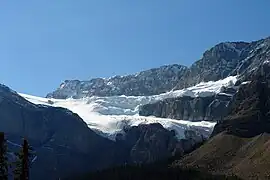 Crowfoot Glacier is located in Banff National Park, Alberta, Canada, 32 km (20 mi) northwest of Lake Louise, and can be viewed from the Icefields Parkway. The glacier is situated on the northeastern flank of Crowfoot Mountain.